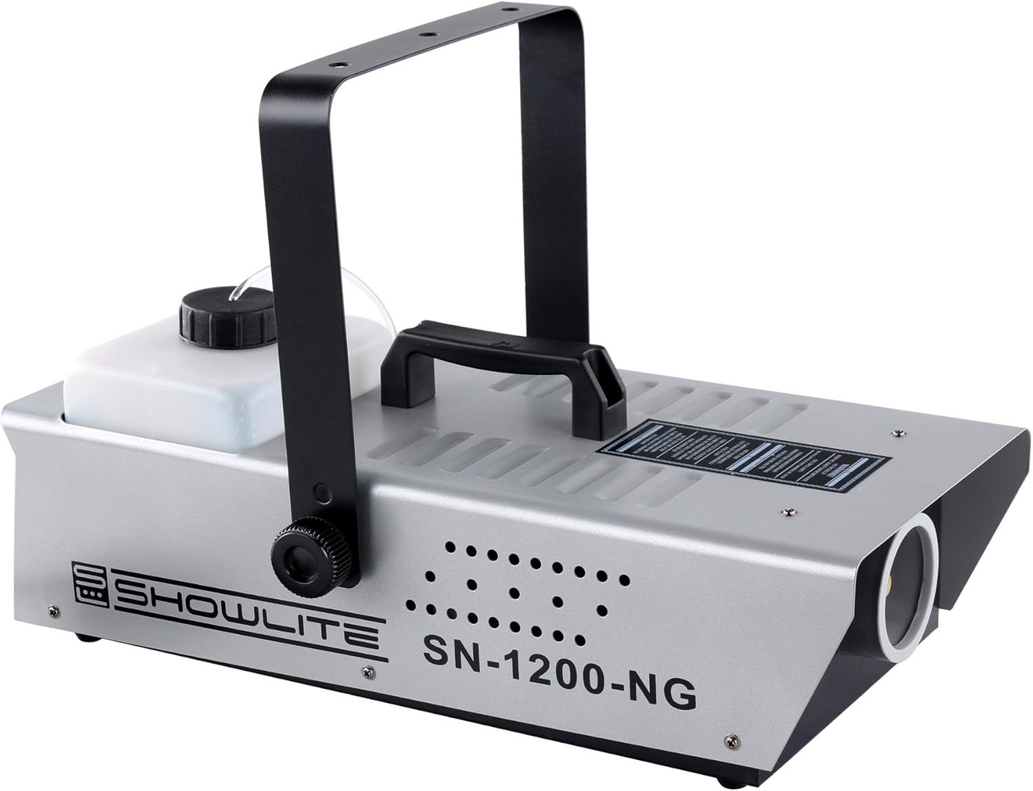 Die Showlite SN-1200 Nebelmaschine mit 1200 Watt ist ideal für DJs, Partykeller, Diskotheken sowie kleine bis mittlere Bühnen. Sie besitzt einen 2-Liter-Tank, eine Aufwärmzeit von ca. 7 Minuten und erreicht eine Ausstoßweite von etwa 5 Metern. Im Komplettset sind eine Fernbedienung sowie 5 Liter Nebelfluid enthalten, und dank Hängebügel ist eine einfache Montage möglich